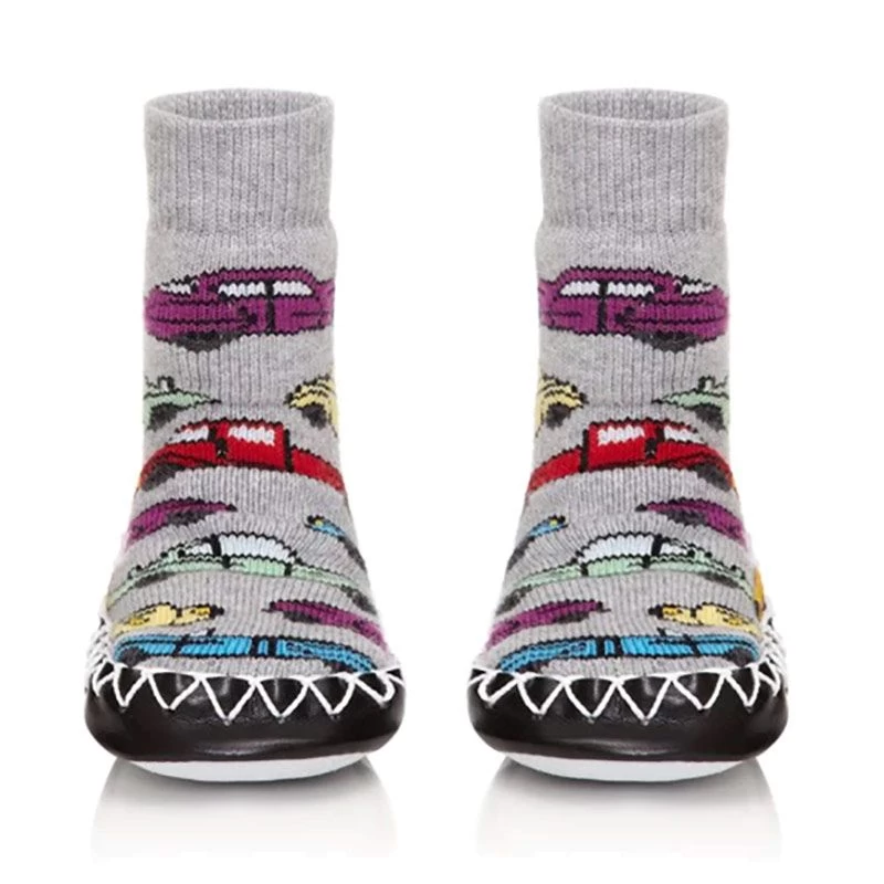 The durable leather moccasin sole provides grip like an indoor shoe while allowing children’s feet to move freely and muscles to develop. Double elastic at the ankle prevents the moccasin from falling off which makes them ideal for nursery or wearing at home.